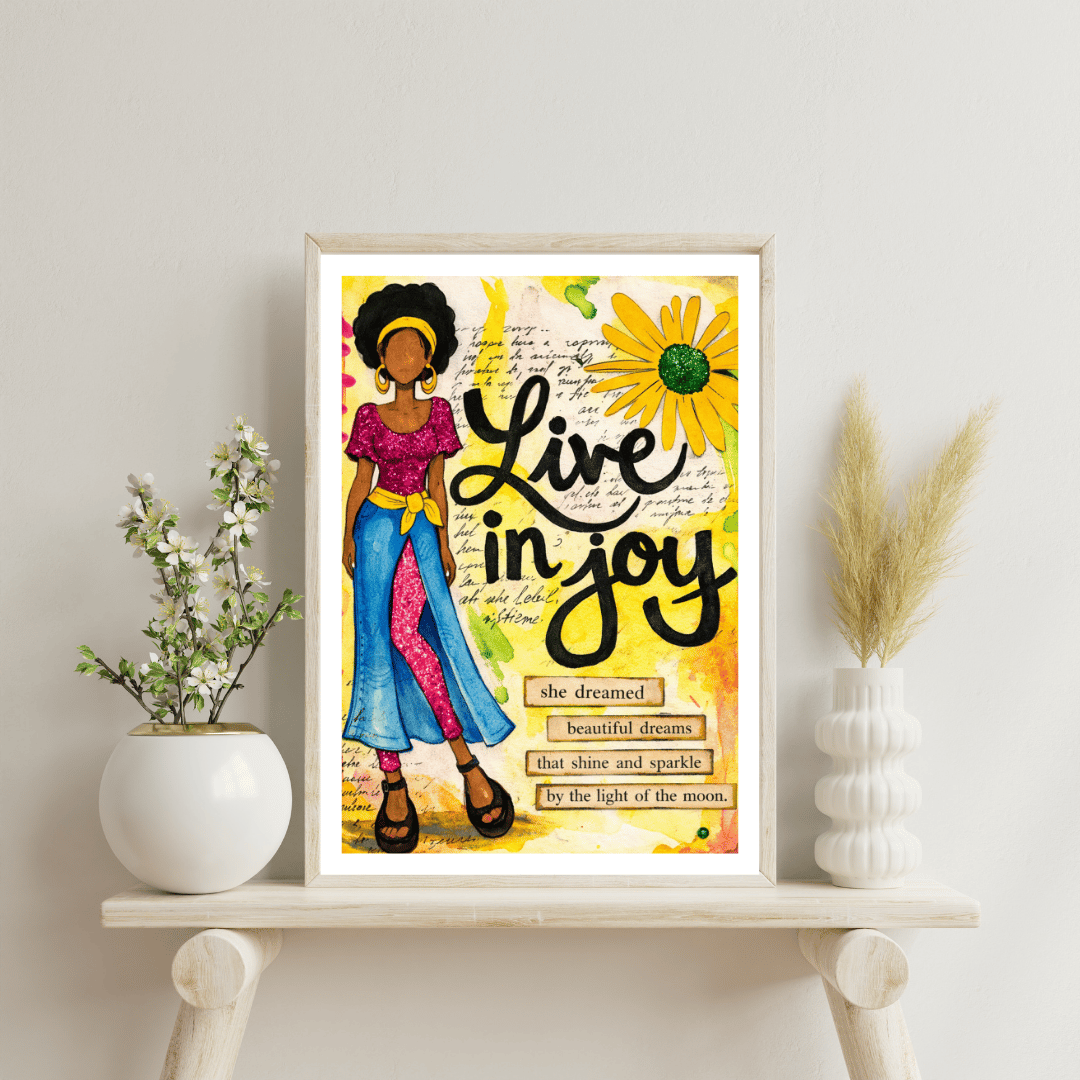 Reprint of my original mixed media artwork "Live In Joy" printed on 40 lb paper and hand-sealed for a soft matte finish.